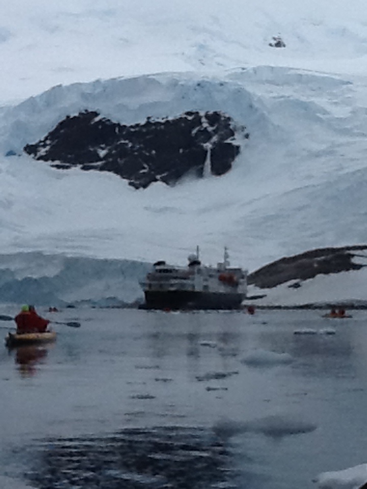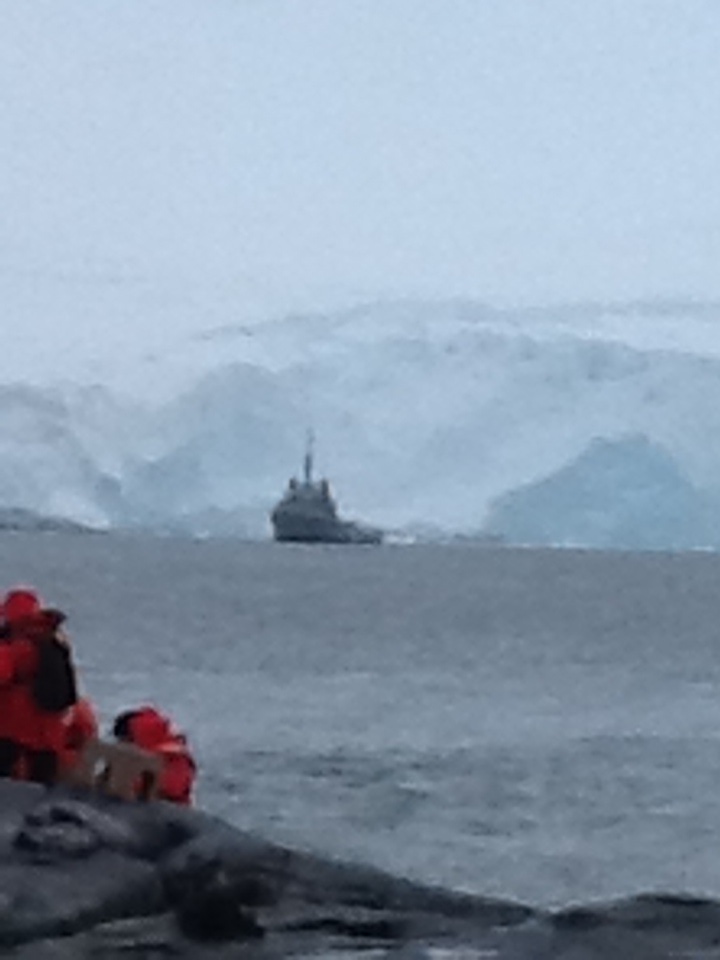 Some problem evidently with the Chilean navy wanting us to park someplace else in a certain bay. Do they think they own the place? No one owns Antarctica. Our German captain won the argument evidently because we parked there and went about our business while the Chilean navy ship watched. I think there’s a picture of it below.